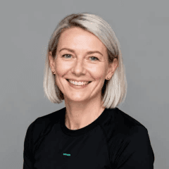Smiling woman in a dark blazer against a blue sky